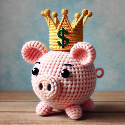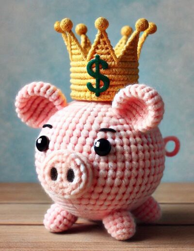 Un cerdito alcancía amigurumi con una pequeña corona de éxito. Cada vez que tu ser querido lo mire, recordará sus metas de ahorro y prosperidad.