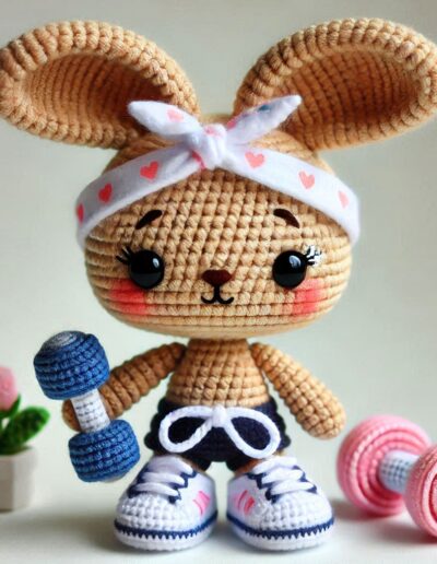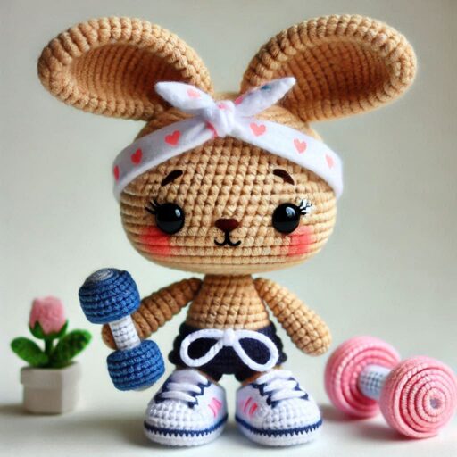 Un adorable conejito con bandana y zapatillas deportivas, sosteniendo una pequeña pesa. ¿Hay algo más motivador que ver esa carita determinada cada mañana junto a tus tenis de running?